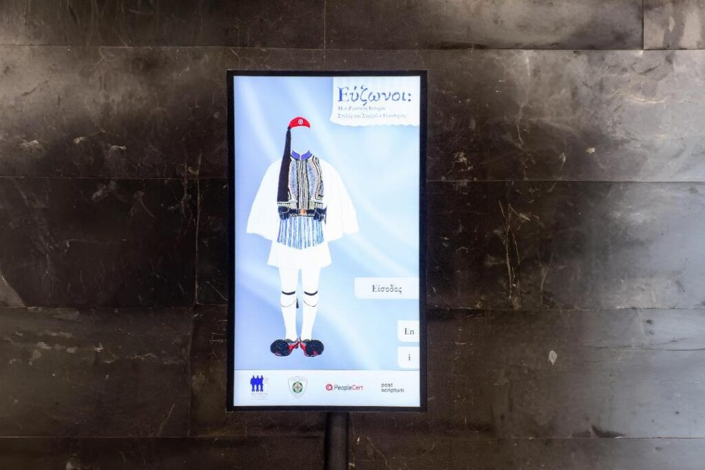 It consists of a state-of-the-art large interactive screen that allows users to explore the historical trajectory of the Evzone units and to discover the eight official uniforms of the Presidential Guard. Visitors can access fascinating information and rich multimedia material about the name, origin, construction materials, colours, and symbolism of each component of the uniforms, which have been meticulously and artistically designed by visual artist and graphic designer Kalypso Evdokidou.